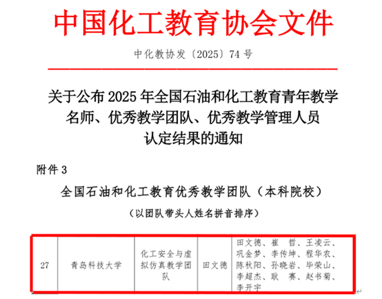 近日,中国化工教育协会公布了2025年全国石油和化工教育青年教学名师、优秀教学团队及优秀教学管理人员认定结果。在全国本科院校获认定的54个优秀教学团队中,山东省本科高校共有5个团队入选,我校唯一入选团队为我院院长田文德教授带领的“化工安全与虚拟仿真教学团队”,荣获“全国石油和化工教育优秀教学团队”荣誉称号。