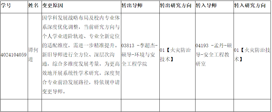 因学生研究兴趣方向发生变化,与现有导师研究领域有显著差异,导师无法予以指导,不具备合作研究的条件,申请变更导师,特此公示,公示日期截止到2025.9.30日,公示期内如有异议请到院办反映。